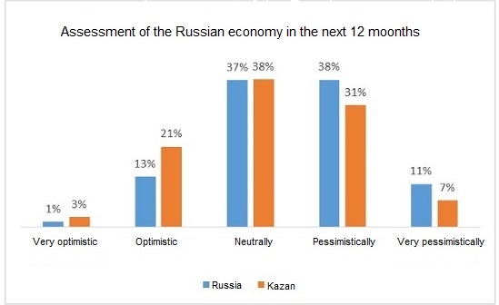 Also, in Kazan there are 15 percent more respondents for whom national identity of the potential employer makes no difference. 41 percent of Kazan inhabitants believe that national affiliation of a company is not important. At the same time respondents from Kazan feel more optimistic about the prospects of the Russian economy over the next 12 months. It is 10 percent more than in Russia among those surveyed who give an optimistic and very optimistic assessment to the perspective of the country.