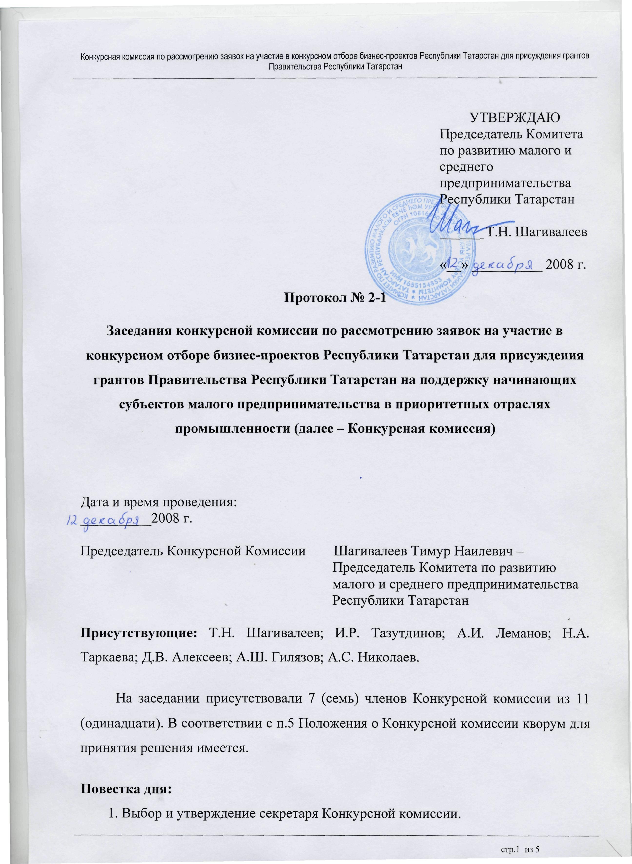 Комитет по развитию малого и среднего предпринимательства Республики Татарстан (далее – Комитет) сообщает, что первое заседание конкурсной комиссии по отбору бизнес-проектов Республики Татарстан для присуждения грантов Правительства Республики Татарстан на поддержку начинающих субъектов малого предпринимательства в приоритетных отраслях промышленности состоялось 12 декабря 2008г. в 9.00 часов в конференц-зале Комитета по адресу: г. Казань, ул. Петербургская, д.50.