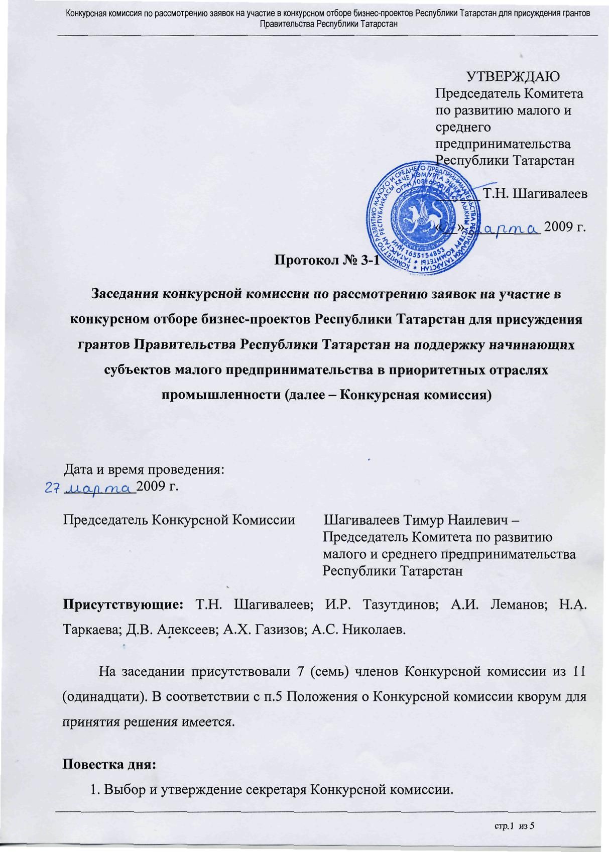 Комитет по развитию малого и среднего предпринимательства Республики Татарстан (далее – Комитет)сообщает, что заседание конкурсной комиссии по отбору бизнес-проектов Республики Татарстан для присуждения грантов Правительства Республики Татарстан на поддержку начинающих субъектов малого предпринимательства в приоритетных отраслях промышленности состоялось 27 марта 2009г.. в 14.00 часов в конференц-зале Комитета по адресу: г. Казань, ул. Петербургская, д.50.