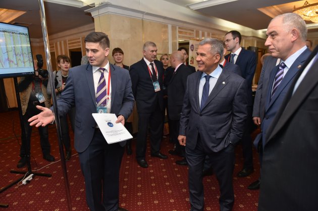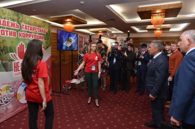 Началась конференция с обхода тематической выставки Рустамом Миннихановым. Более десятка экспонентов представили много интересного – от чистых по составу продуктов до спецоборудования. Также свой стенд «Молодежь Татарстана против коррупции» подготовило Республиканское общественное объединение творческой молодежи. На молодежном стенде Президент республики на интерактивной карте отметил Татарстан как территорию, свободную от коррупции, установив специальный магнит-символ.