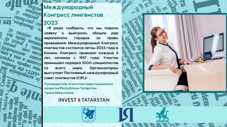 «Мин заявка бирүебезгә һәм отуыбызга шат, үткәрү хокукы өчен берничә Европа шәһәрләрен узып киттек. Халыкара лингвистлар конгрессы 2023 елның җәендә Казанда узачак. Конгресс 1957 елдан башлап һәр 5 ел саен уздырыла. Анда бөтен дөньядан 1000ләп белгеч катнаша. Чараны даими халыкара лингвистлар Советы (CIPL) оештыра», – дип Татарстан Республикасының инвестицион үсеш агентлыгы җитәкчесе Талия Миңнуллина билгеләде.