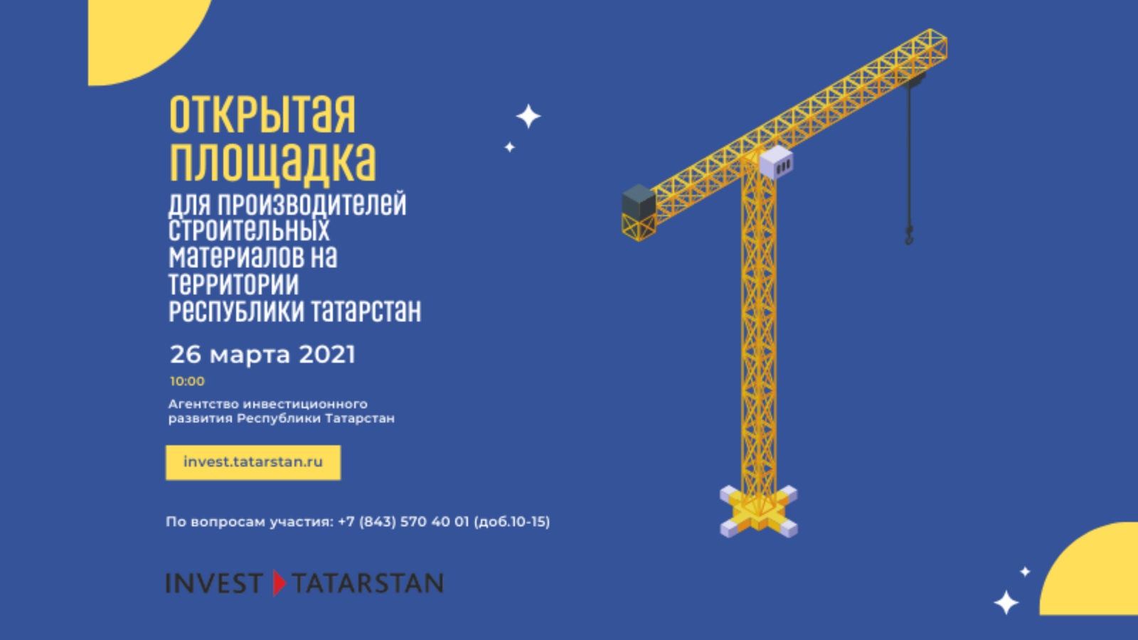Татарстан төзүчеләренең һәм девелоперларының төзелеш материалларының җирле җитештерүчеләр белән эшлекле бәйләнешләрен берләштерү кысаларында 26 мартта 10:00 сәгатьтә ТР Инвестицион үсеш агентлыгы ТР Төзелеш, архитектура һәм торак-коммуналь хуҗалык министрлыгы белән берлектә Татарстан продукциясен тәкъдир итү һәм төзүчеләр белән контактлар алмашу өчен ачык мәйдан оештыра.