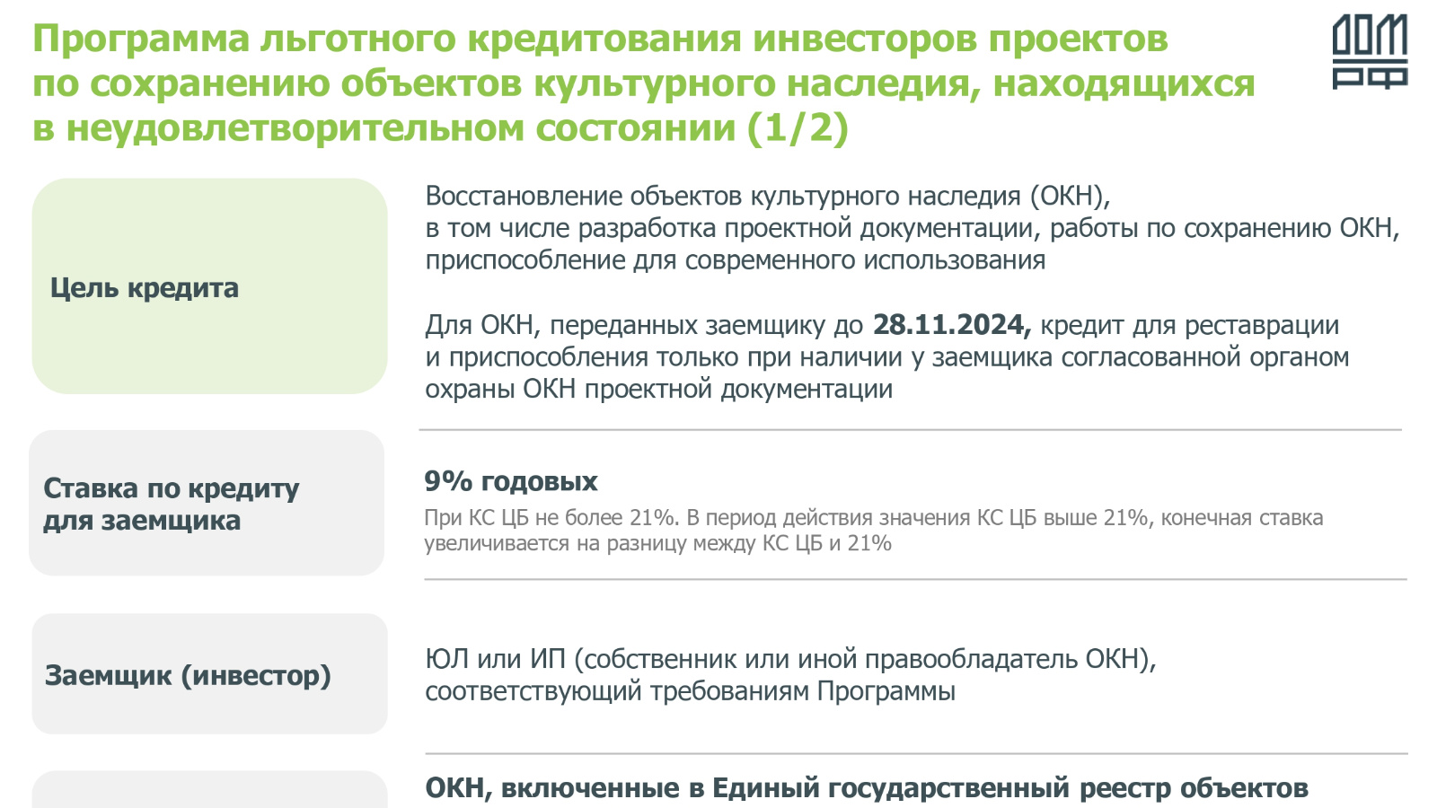 Ташламалы кредитны гавами милекнең теләсә кайсы төреннән (федераль, региональ, муниципаль) инвестор арендалый яисә сатып ала торган ММОларын торгызу максатларында алырга мөмкин. Шул ук вакытта программаны гамәлгә ашыру башланганчы инвесторга тапшырылган ММОларга ташламалы кредит бирү (28.11.2024) ММО саклау эшләрен башкаруга билгеләнгән тәртиптә ММОларын саклау, файдалану, популярлаштыру һәм дәүләт саклавы өлкәсендә вәкаләтле орган тарафыннан килештерелгән проект документациясе булганда гына мөмкин.