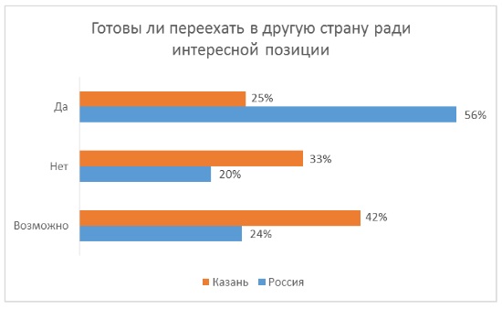 Шундый республикалар арасында булган Татарстанда яшәүчеләр экспертларның бу хакта фикерен раслыйлар, һәм Antal Russia рекрутинглау компаниясе аналитикасы ярдәмендә без моңа ышана алдык. Башка регионнарда яшәүчеләр белән чагыштырганда Казанлылар кызыклы эш өчен чит илгә китәргә сирәк очракларда гына әзер. Аналитиклар отчеты мәгълүматлары буенча, Казанда сорашып чыкканнарның 25 проценты гына сөйкемле урын өчен башка илгә китәргә әзер. Шул ук вакытта гомумән алганда Россия респондентлары арасында сорауларга җавап биргәннәрнең яртысы китәргә әзер булдылар. 33 процент Россиядә карьера төзергә тели дип һичшиксез ышана. Барысы Россия һәм халыкара компанияләрнең 5,5 меңнән артык хезмәткәренә сорау бирелде.