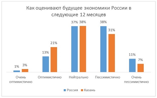 Шулай ук Казанда ихтимал булган эш бирүченең милләте мөһим булмаган респондентлар 15 процентка күбрәк. Казанда яшәүчеләрнең 41 проценты компаниянең нинди илдә урнашуы мөһим түгел дип саныйлар. Шул ук вакытта Казандагы респондентлар алдагы 12 ай эчендәге Россия икътисадының киләчәген оптимистик рәвештә бәялиләр. Аларның арасында, гомумән Россия буенча сораштырылганнарга караганда, илнең киләчәгенә оптимистик һәм бик оптимистик бәя бирүчеләр 10 процентка күбрәк.